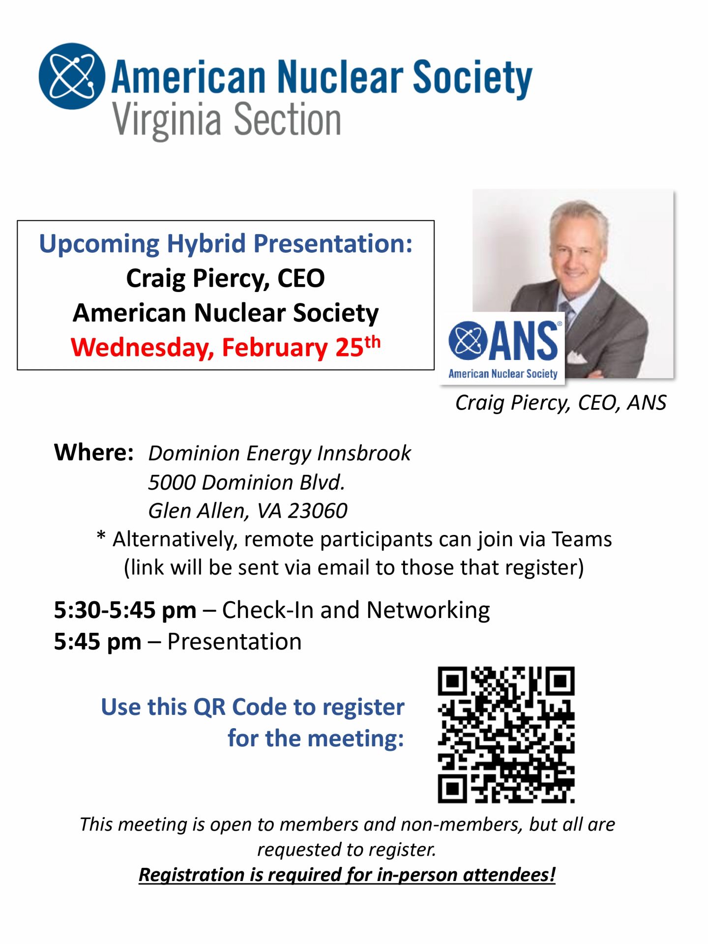 We're excited to have Craig Piercy, CEO and Executive Director of the American Nuclear Society, join us at Innsbrook for a hybrid presentation on February 25. The event will be held in-person at Dominion Energy, with a virtual option available via Microsoft Teams. This is a fantastic chance to hear directly from National ANS leadership, and we encourage all to attend.
